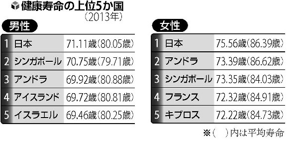 世界188か国のデータを分析した結果2013年の日本の健康寿命は男性71・11歳、女性75・56歳で世界一だったそうです。